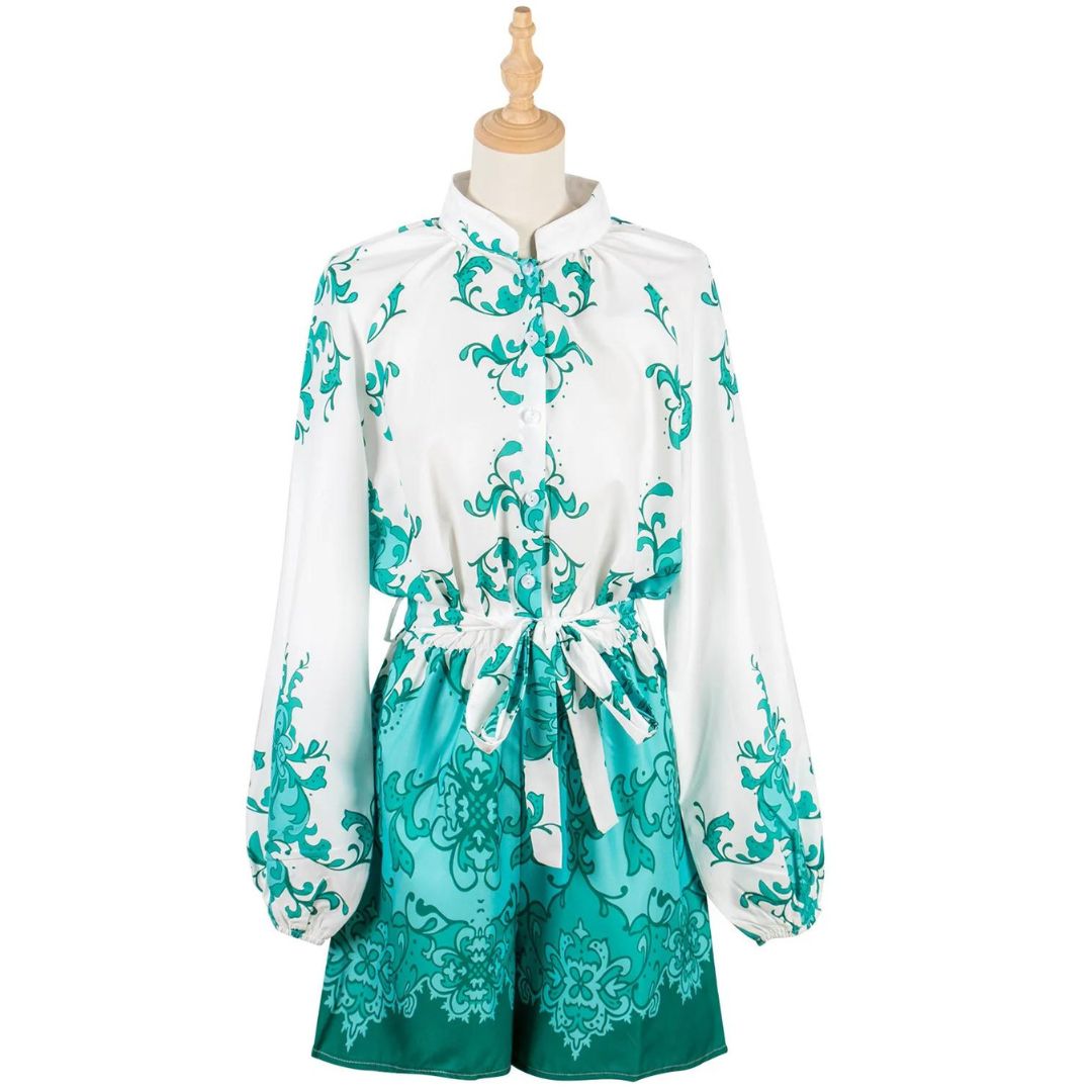 Pictured is a Valentina - Chic playsuit with floral print and waist tie, in bright white with a vibrant green floral pattern. The design is characterised by an accentuated waist with a tie ribbon that creates a flattering silhouette. The long sleeves balance the shorter length of the shorts. This playsuit strikes a nice balance between casual and chic and is perfect for day trips or a casual brunch with friends.