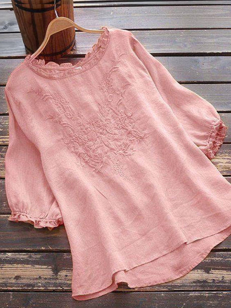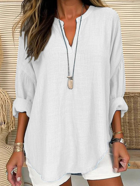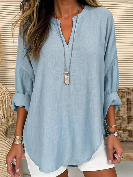 Women's V-neck Cotton And Linen Solid Colour Loose Mid-Sleeve Shirt