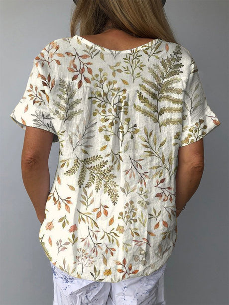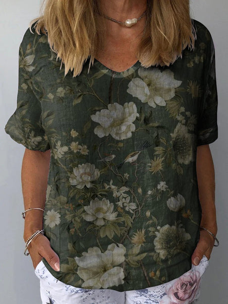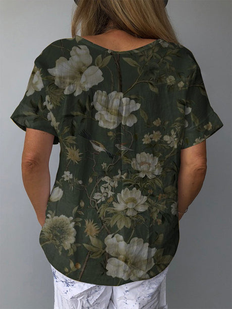 Foliage Flowers Women's Print Casual Cotton And Linen Shirt