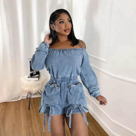 Carina - Off-the-shoulder denim playsuit with drawstring waist