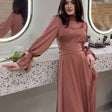 Embrace timeless elegance with the Seraphina - Chic dress with turtleneck and gathered waist, a perfect fusion of classic style and modern sensibility. This piece captivates with its muted pink hue and flowing lines, while the emphasised waist and billowing sleeves add a touch of drama. Ideal for those seeking a sophisticated look with a contemporary edge.