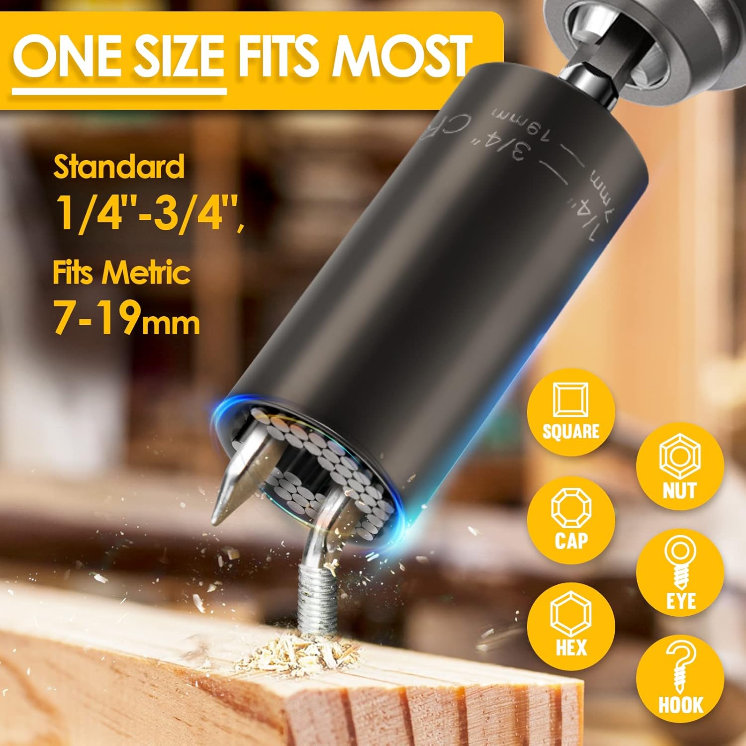 - One Super Universal Socket Multi Tool Fits Most Bolts Nuts: Aposhion universal socket grip comes with a power drill adapter, which can connect with most drills, electric screwdrivers and manual ratchet kits easily. Very great for home improvement, carpentry tools, auto repair, home renovations, household maintenance, woodworking. The super universal socket set is ranging from standard 1/4” to 3/4” (7-19mm). It's a must-have cool gadget for men women, tools gifts for men women dad him husband