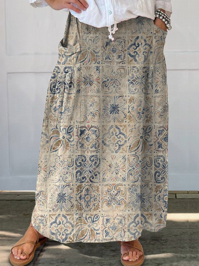 Women's Retro Floral Ethnic Art Print Casual Linen Pocket Skirt